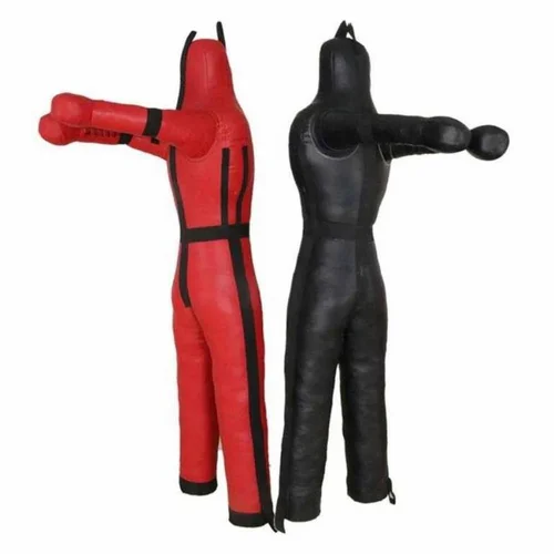 Judo wrestling training dummy, 1-2ft in size, weighing 10kg. Constructed from wood, sand, and cotton padding in red. Made in India.