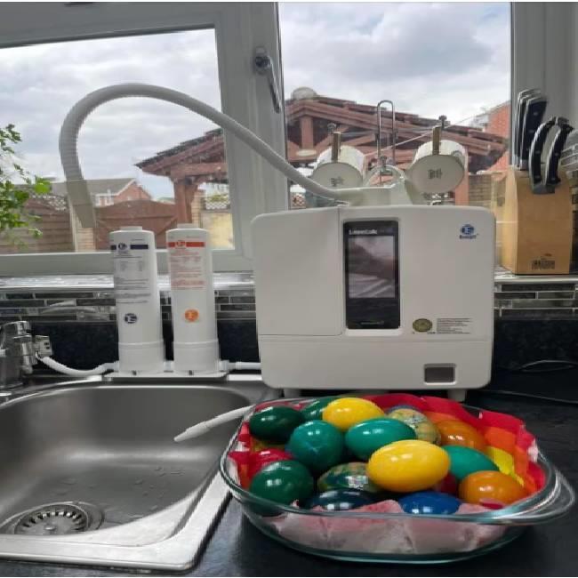Kangen Water Device. Produces alkaline ionized antioxidant water with a pH range of 2.5-14. Features LCD display, 240V power, and 10 FPM flow rate.
