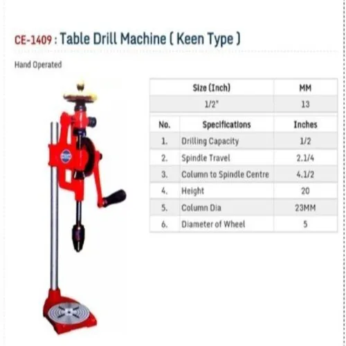 Keen Type manual drilling machine with 56mm spindle travel and 13mm steel drilling capacity. Features 23mm column diameter and 112mm max distance from spindle axis to column.