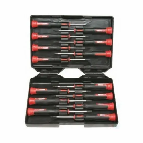 14-piece precision screwdriver set with PH, slotted, and TX tips. Features chrome finish, burnished tips, and plastic handles. Packaged in a durable plastic box.