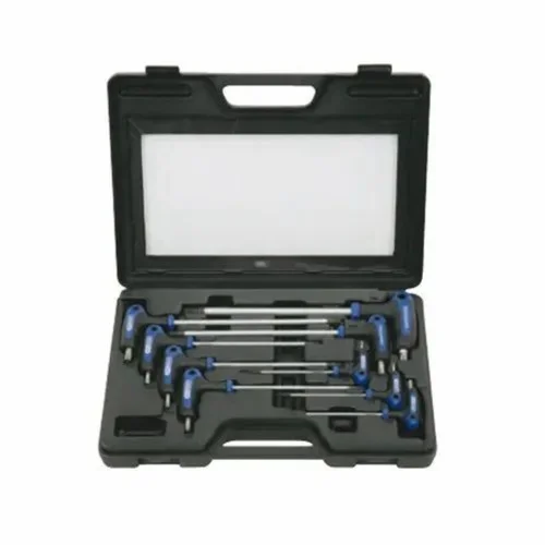 9-piece T-handle tamperproof key wrench set made of durable alloy steel. Features male key case type for secure storage and easy access to various sizes.