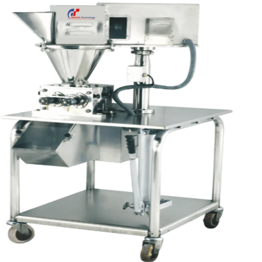 Automatic lab roll compactor machine for pharma applications. Features SS material construction, 50 kg/hr capacity, variable RPM, and 100/25 roll size.