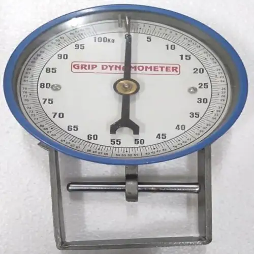 GRAY hand grip dynamometer, Model AB-525, for laboratory use. Features 99.9% accuracy and is made in India. Designed for precise grip strength measurements in research and clinical settings.