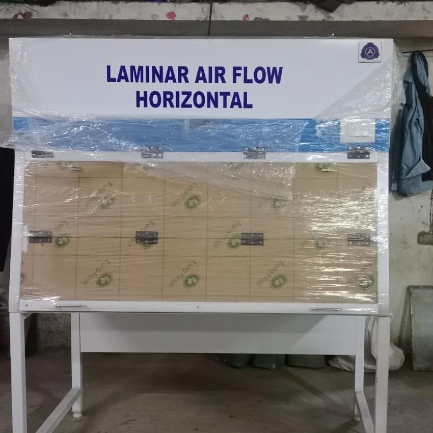 Horizontal laminar airflow workstation for laboratories, 4*2 ft. Made of mild steel with powder coating, 99.99% efficiency, 240V operation, and vertical airflow.