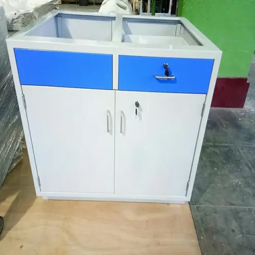 PP/GI/MS/SS/FRP laboratory table, 16-gauge thickness, 50kg weight. Ideal for chemical labs, R&D, and chemistry departments. Blue table cover designed for chemical storage.