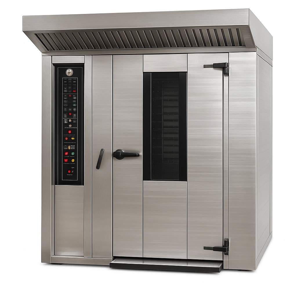Automatic, large wooden fired oven with 126 SS304 trays. Electric powered (3 KW, 440V, 3 Phase). Suitable for bakeries with 1000-2000 Kg capacity.