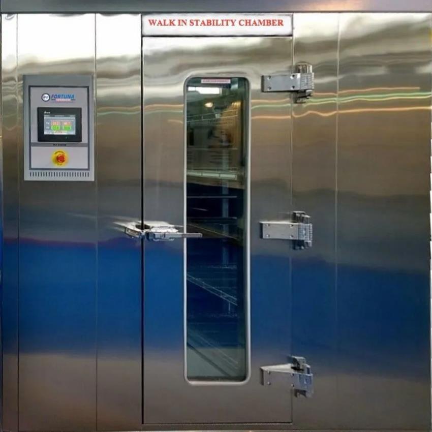 6000-50,000 litre walk-in chamber with condenser. SS304 material, 12-54 shelves, touch screen display. Operates on 230V AC, 50 Hz for environmental testing.