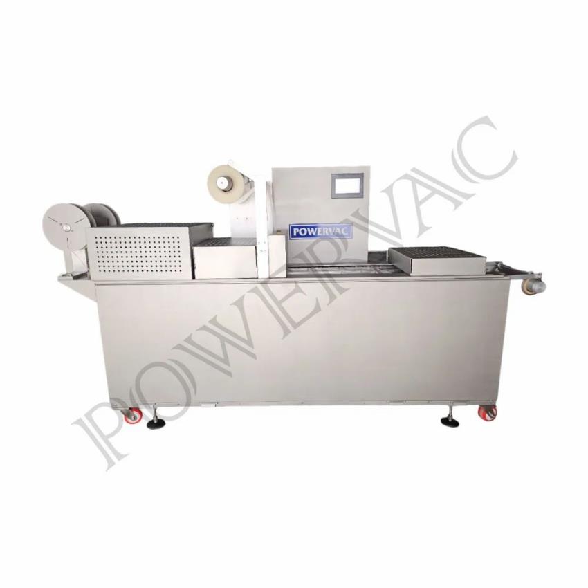 Automatic LDPE vacuum thermoforming machine, 440V, for paneer, dates, dry fruits. Servo motor driven, produces trays with 40-80 mm forming depth.