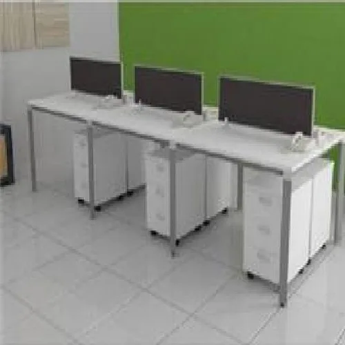 Six-seater linear office workstation with aluminum and wooden construction. Measures 4 feet height, 3 feet length, and 2 feet width for efficient office space utilization.