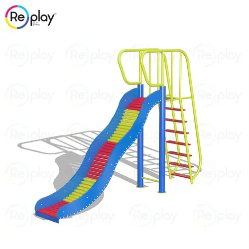 LLDPE wave roller slide for outdoor playgrounds, product code RE-02-SL. Features a 1-year warranty and a 20 X 6 X 12 ft safe play area.