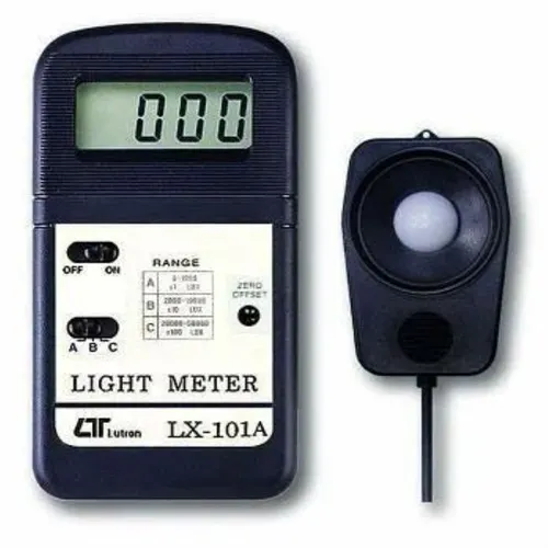 Digital lux meter for light measurement. Made in India, features a digital display and standard operating temperature and type specifications.