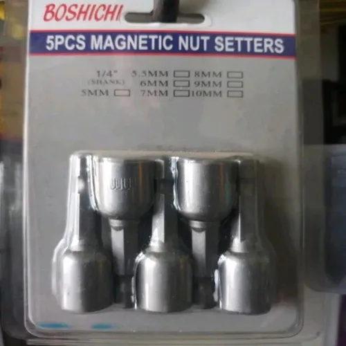Boshichi 4-inch two-in-one magnetic nut setter screwdriver. Constructed from iron, suitable for industrial applications. Packaged in packets of 5 pieces.