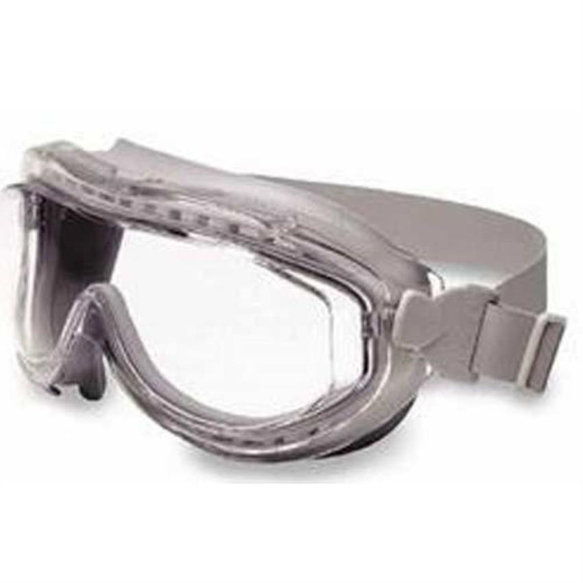 Male transparent safety goggles made from glass with polycarbonate lenses. Features scratch resistance and break resistance. Adjustable frame for a comfortable, secure fit.