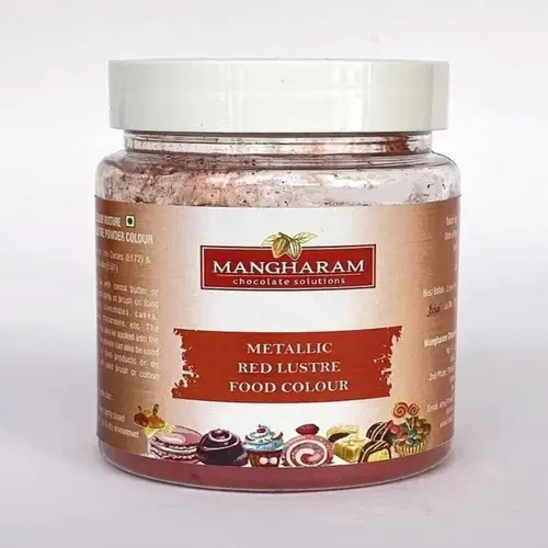 Metallic Red Lustre powder for bakery applications. This 25 gm jar product is ideal for adding a vibrant color and shimmer to baked goods. Made in India.