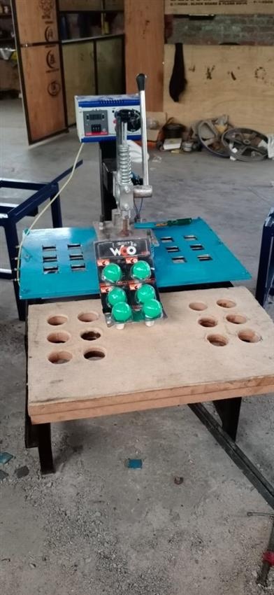 Manual single-phase blister packing machine operating at 220V. Specifically designed for LED bulb packaging. Made in India.