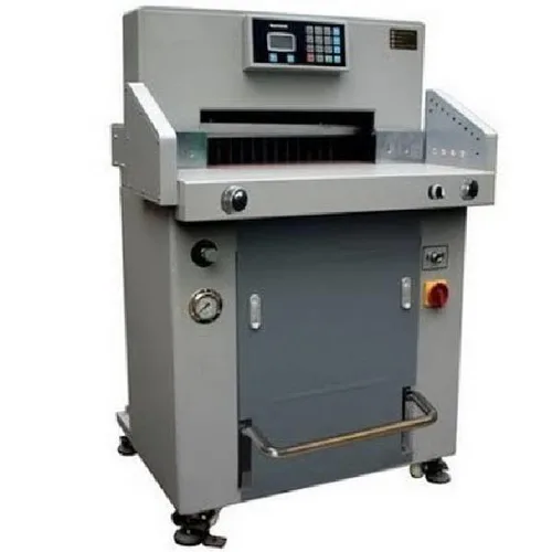 Manual paper cutting machine featuring an iron base plate and a 25-liter coolant tank. Operates on 220-440V power. Designed for efficient manual paper handling.