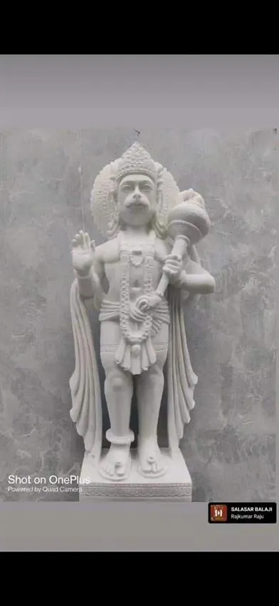 White marble statue of Hanuman. A powerful and revered deity represented in durable marble. Suitable for home or temple adornment.