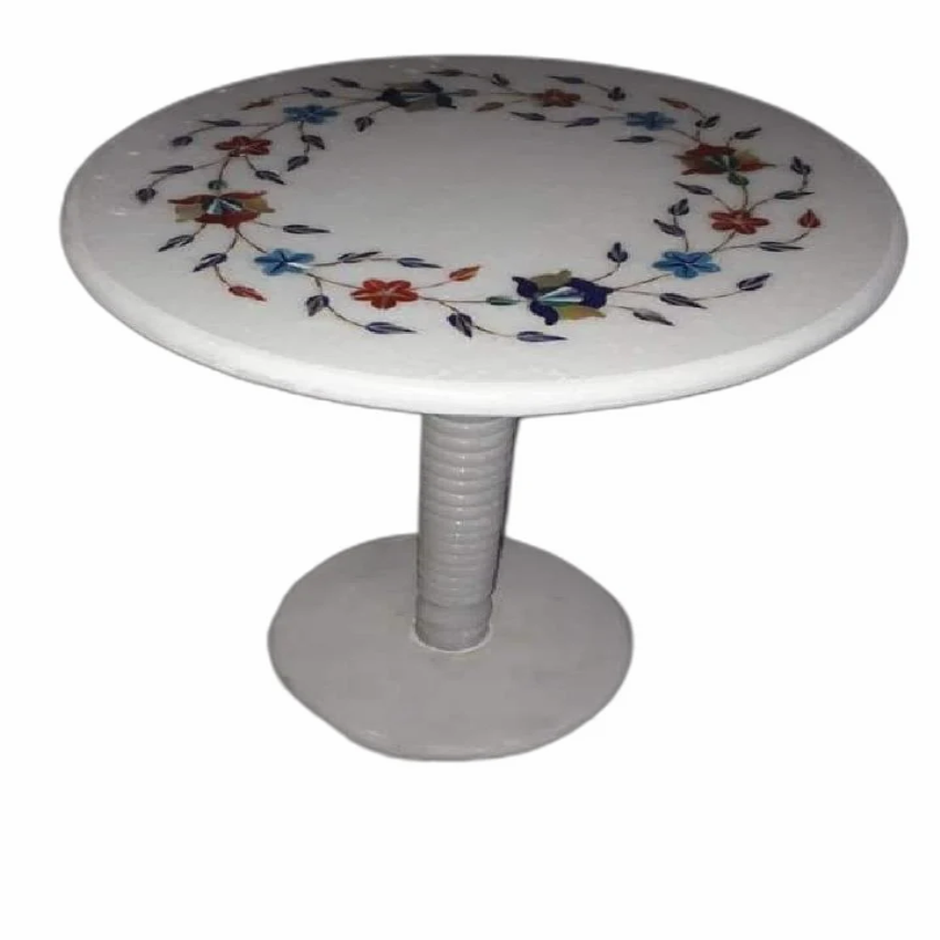 Marble inlay tea table with 3 feet height. Ideal for restaurant use. Features a white, printed, outdoor design. Available in stock. Enhances dining or lounge spaces.