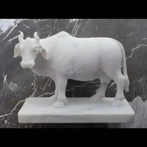 Polished white marble Kamdhenu cow statue in a standing posture. This religious sculpture is ideal for devotional spaces and home altars.