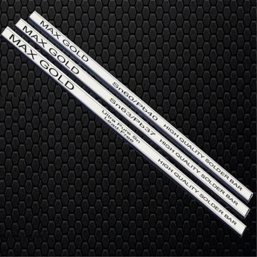 Max soldering bars, 60/40 tin/lead composition. Grey/silver color. Used for wave soldering and hot dip soldering applications in industrial settings.