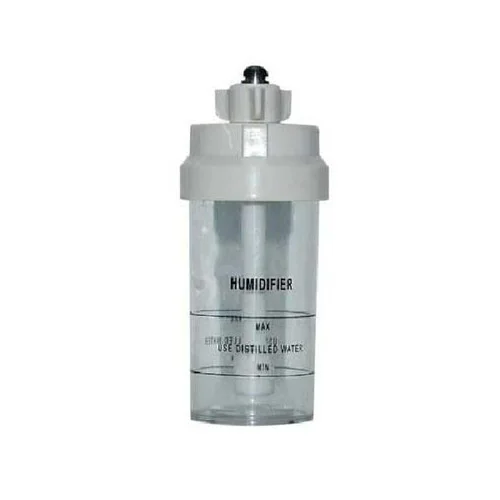Standard humidifier bottle for medical use. Designed to attach to oxygen flowmeters and provide humidified air. Essential accessory for oxygen therapy.