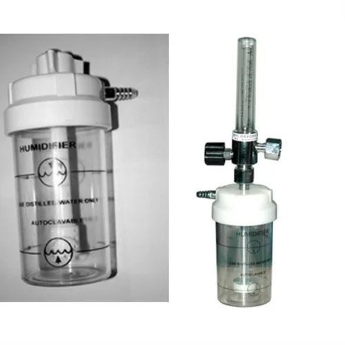 Standard humidifier bottle for medical gas humidification. Designed for easy connection and refilling. Ensures optimal moisture delivery for patient comfort during oxygen therapy.