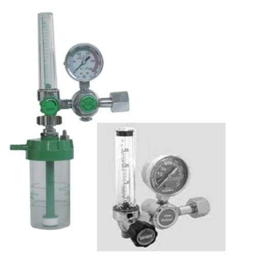 Anodized aluminum medical oxygen flowmeter with regulator, 0-10 L/min flow rate. Includes polycarbonate tube cover and humidifier bottle. Made in India.