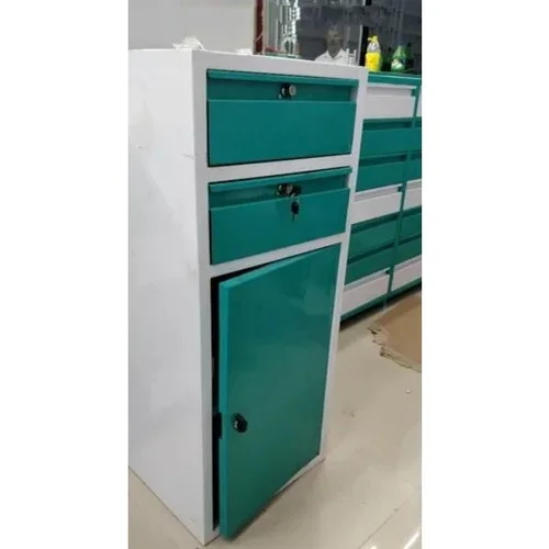 Metal steel medical cash counter with four legs and drawers as required. Available in any color choice for all shop applications.