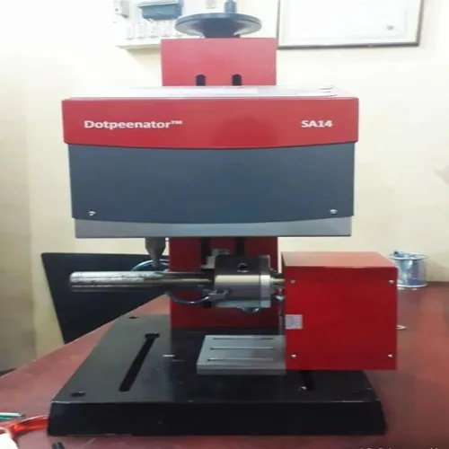 Metal dot peen marking machine with rotary axis (SA14). Capacity 170mm x 120mm. Requires 2-6 bar air pressure. RS232 communication. Marks from 1.8mm character size.
