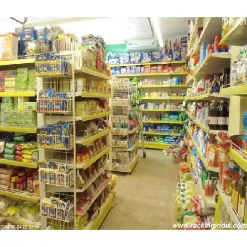 Metal supermarket shelves for grocery display. Features 18"x36" and 15"x36" stand depths with multiple 12"x36" shelves. Requires assembly for efficient product showcasing.