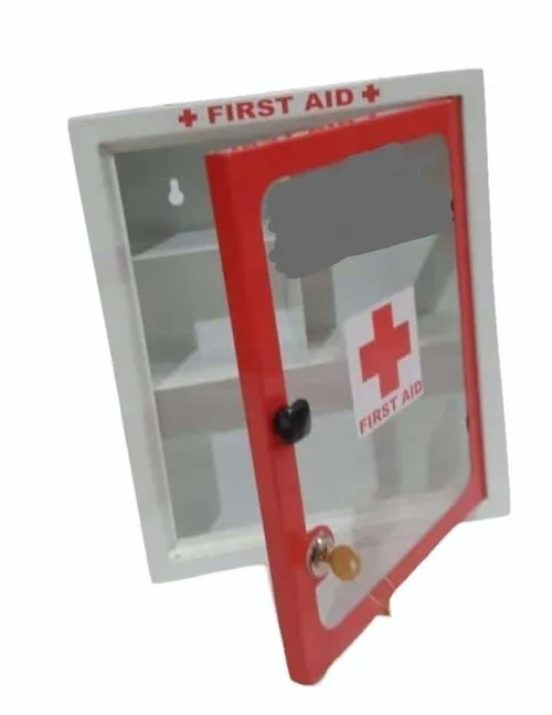 Powder-coated metal wall-mounted first aid box. Dimensions: 13" x 11" x 3". Durable construction for industrial applications. Secure storage for medical supplies.
