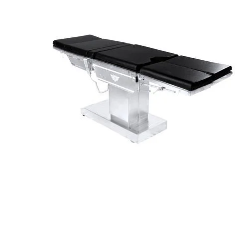 Silver electric operation table with a sliding top, featuring a 50mm foam mattress. Non-portable, adjustable, and electrically controlled for precise positioning. Stainless steel construction.
