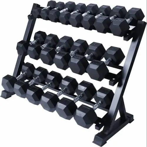 Commercial grade mild steel 3 tier horizontal rack for fitness equipment. Durable construction for intensive use. Origin: India.