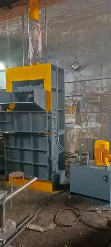 Semi-automatic mild steel hydraulic cotton waste baling press for industrial use. Features up to 150-ton capacity, operating on 50 Hz, three-phase power.