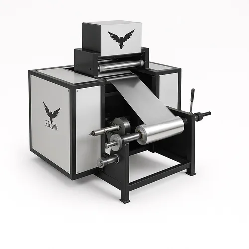 Automatic mild steel aluminum foil roll rewinding machine. Features 1 HP power consumption, 60 Hz frequency, and a production capacity of 700 rolls per shift.
