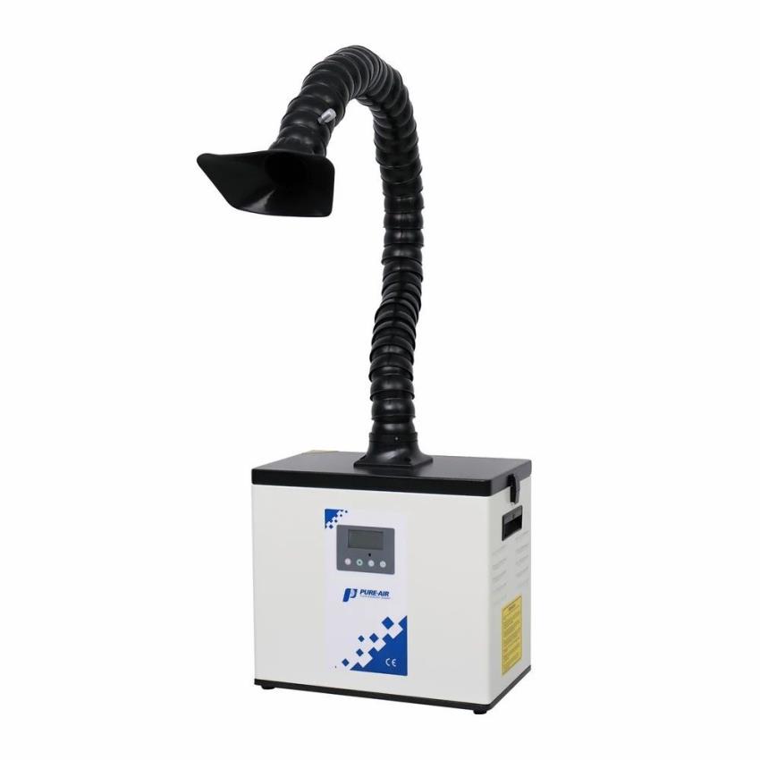 Semi-automatic mild steel fume extraction machine for laser marking. Features F5 primary filter, ≥99.9% filtration efficiency at 0.3 microns.