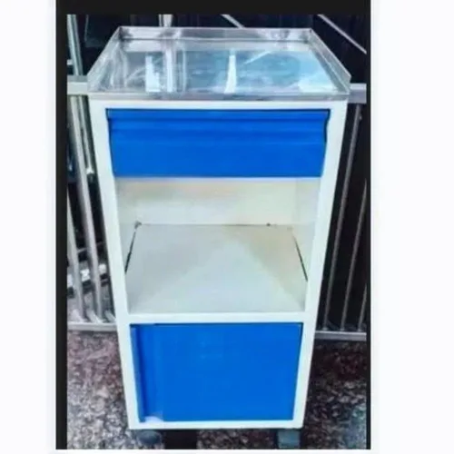 Mild steel bedside cabinet for hospital applications. Blue color with a steel finish. Manufactured in India. Minimum order quantity of 1 unit.