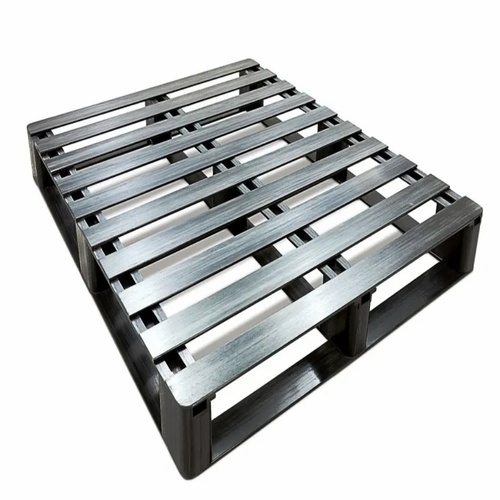 Grey mild steel industrial pallet, 500 kg capacity. Dimensions: 1200 x 1200 x 130 mm. Made in India. Suitable for heavy-duty industrial applications.