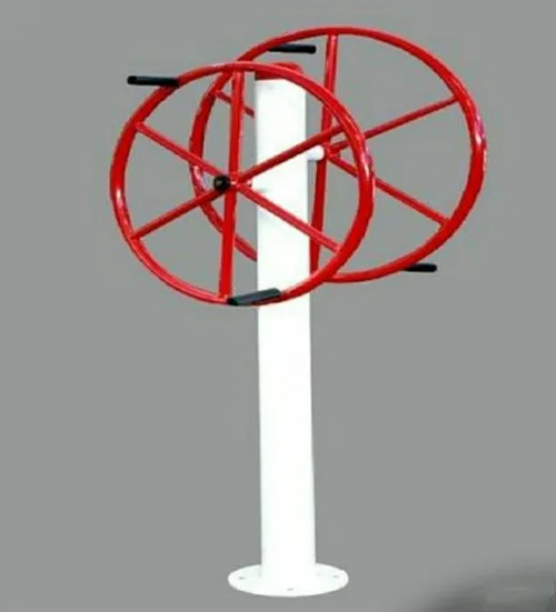 Manual outdoor gym equipment made from mild steel. Features two wheels, non-portable design, and a customized red/white color scheme. Model MF106.