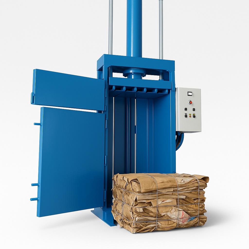 Semi-automatic mild steel paper baling press machine. Features 10 HP motor, 850x600mm platen size, 150L oil tank, and 2500 KG weight. Fabricated design for efficient waste management.