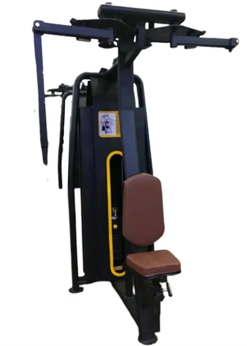 Gym chest press machine, butterfly type, made of mild steel (Fe 500 grade). Targets chest muscles with a maximum user weight of 250 Kg. Available in brown and black.