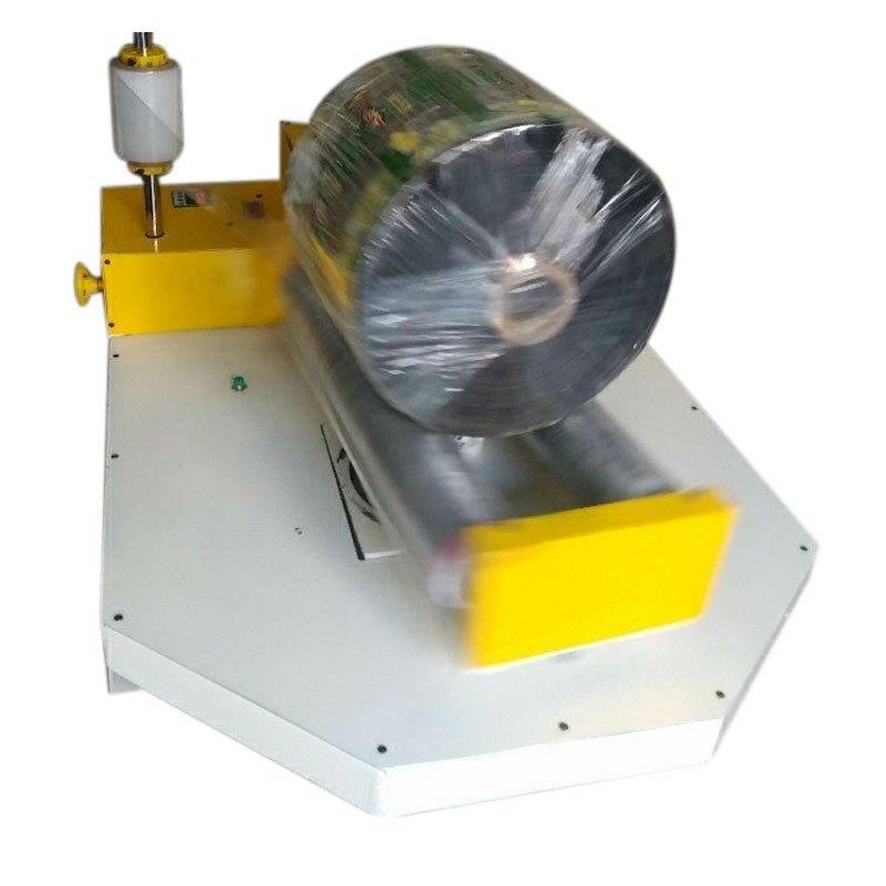 Semi-automatic mild steel stretch roll wrapping machine, 230V, 50Hz, AC control. Features 1 HP carriage motor, 700 kg weight, 460 mm diameter, and 100 kg RS Technology capacity.
