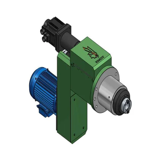 Single spindle servo-driven drilling and tapping head unit made of mild steel. Features a flange-type design for industrial automation applications. Polished green finish.