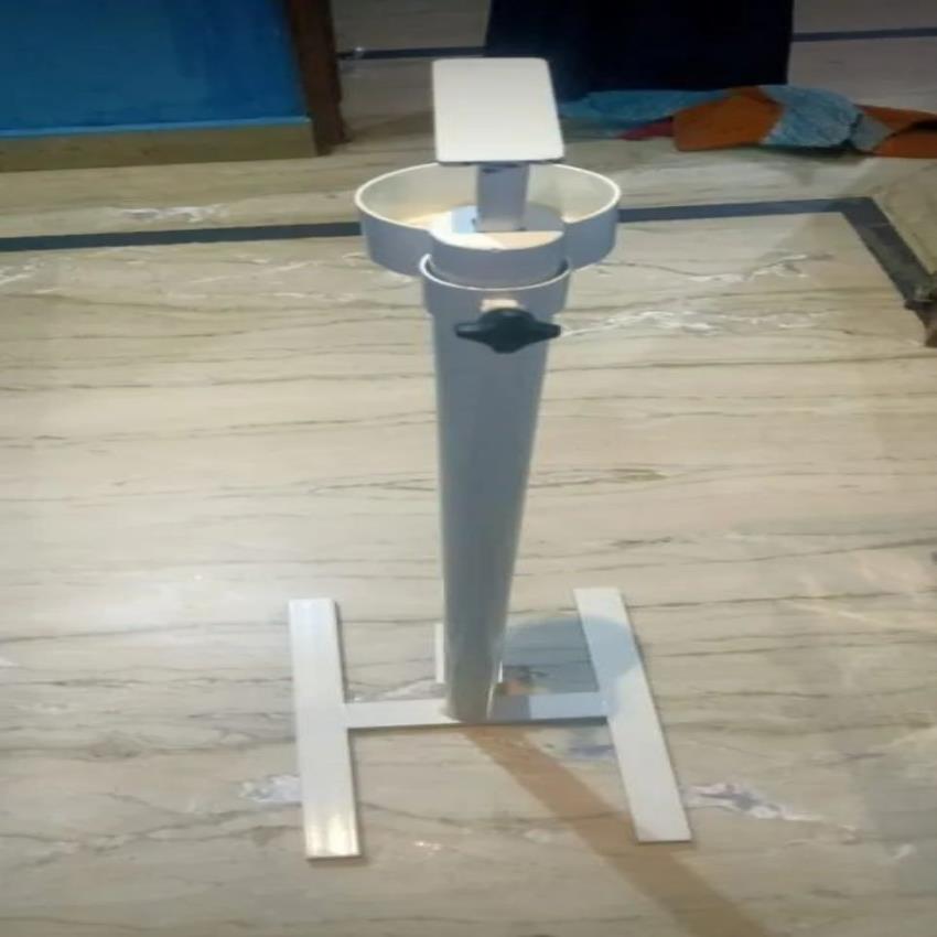 Foot operated sanitizing machine constructed from mild steel and stainless steel. Accommodates any bottle size for flexible sanitizer dispensing.