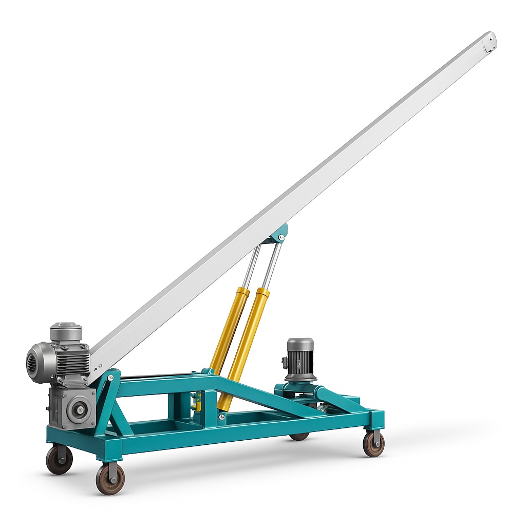 Mild steel belt conveyor for loading/unloading in warehouses. Manual/automatic operation, inclined design, 20 ft length. Handles 100 kg/ft, speed 60 m/min.