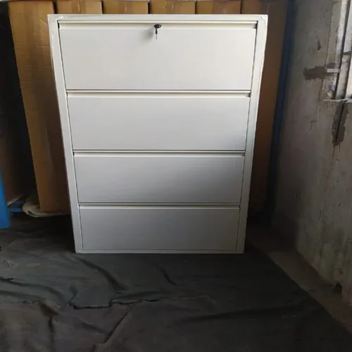 White mild steel shoe rack with powder-coated finish. Features wall mount design, 3 shelves, and 4 doors. Includes a drawer for added storage.