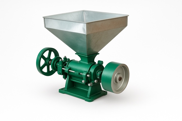 Automatic mini rice huller, 2 HP, single phase. Features 1200-1800 kg/hr capacity and operates at 940-1200 RPM. Requires paddy separator.