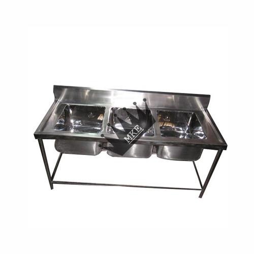 Three-sink washing unit constructed from durable stainless steel. Plain pattern, new condition, packaged in carton. Designed for efficient multi-station washing.