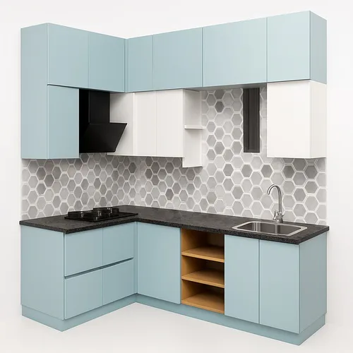 Wall-mounted wooden modular kitchen cabinets with mica finish and laminated doors. Available in modern styles. Includes handles, knobs, and drawer slides. 18mm BWP plywood construction.