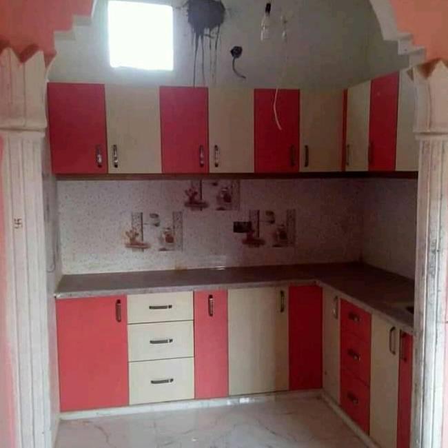Contemporary wooden kitchen design. Features durable construction and a stylish aesthetic suitable for modern homes.